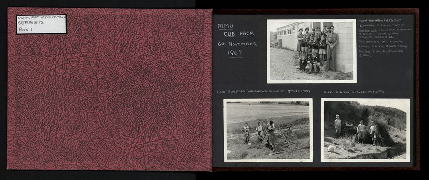 A variety of activities are shown in the photograph album created by the Ashhurst Scout Group, including examples of bush craft, a handicraft expo, games and several Field and Cub Days. Group photographs are also included.
