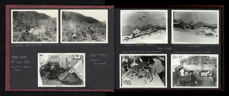 A variety of activities are shown in the photograph album created by the Ashhurst Scout Group, including examples of bush craft, a handicraft expo, games and several Field and Cub Days. Group photographs are also included.