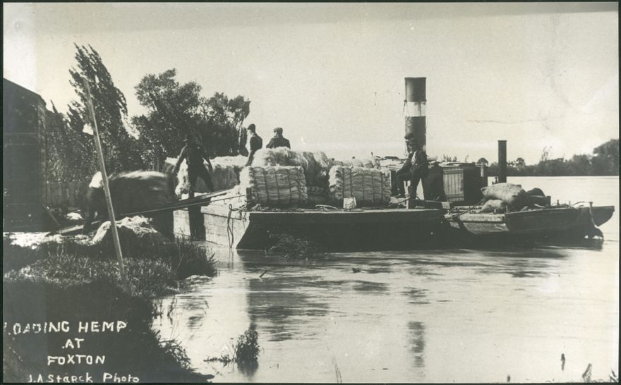 Workers loading bales of flax onto a punt on the Manawatū River.