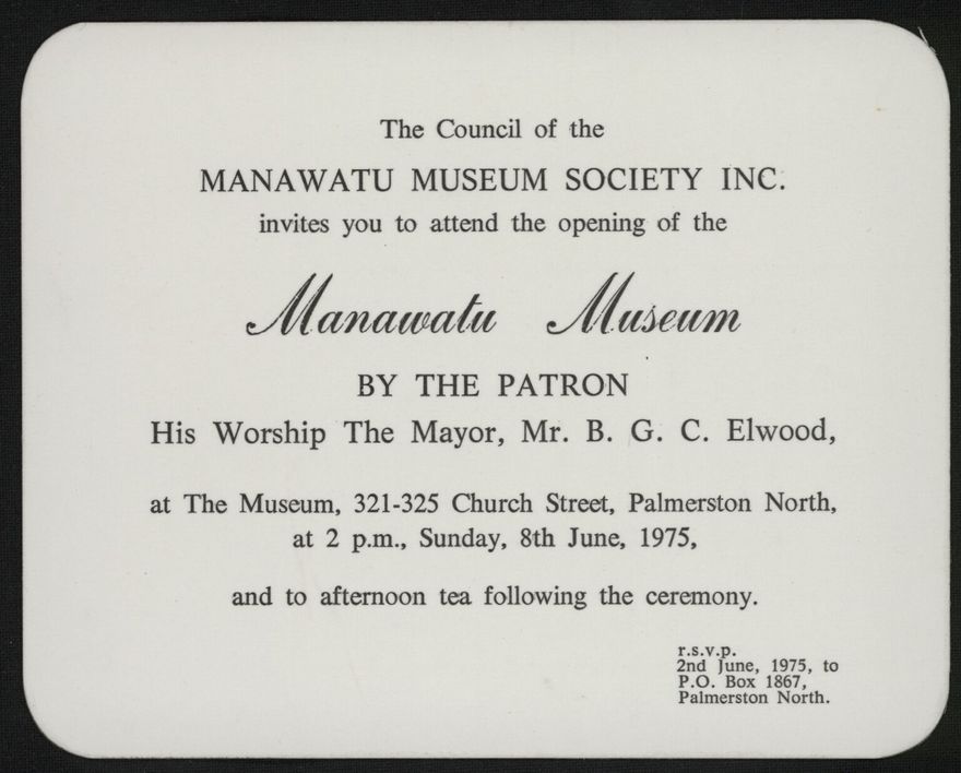 The Manawatu Museum opened in the former Pierard building (built 1925) in 1975. From the invitation: "The Council of the Manawatu Museum Society Inc. invites you to attend the opening of the Manawatu Museum by the patron His Worship The Mayor, Mr B. G. C. Elwood at the Museum, 321-325 Church Street, Palmerston North at 2 p.m., Sunday, 8th June, 1975, and to afternoon tea following the ceremony."