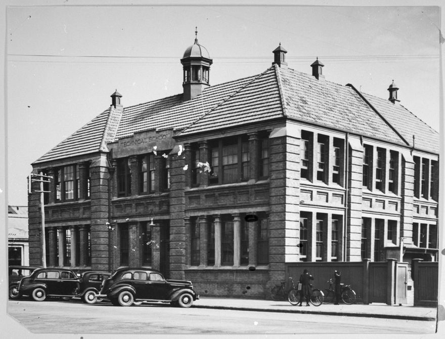 The Technical School main building on Duke Street (now Princess Street) was built in 1909. In 1931 the main building was strengthened and the gables were removed. The Palmerston North Technical School occupied the building until 1956. It is now used by the Universal College of Learning (UCOL).