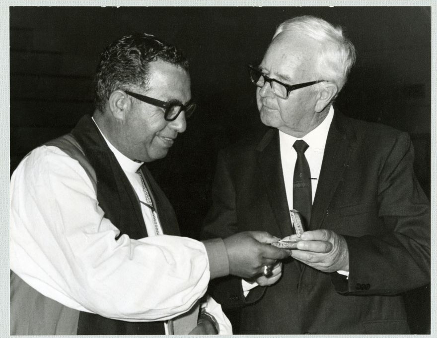 Len Plimmer, Secretary Organiser presents a centennial medal to the Bishop of Aotearoa, Right Reverend Manu Bennett at a meeting held after a Centennial Celebrations church service at the YMCA stadium, Grey Street, Palmerston North.