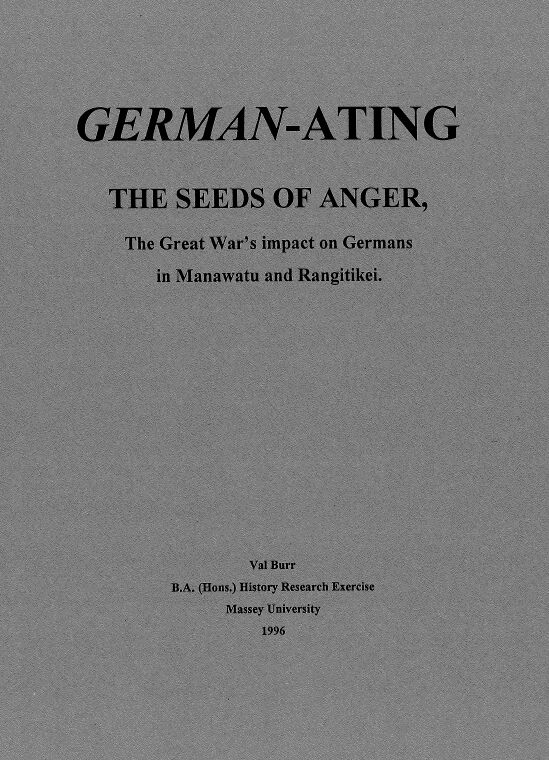 This is Val Burr's B.A (Hons) History Research Exercise for Massey University. It discusses German emigration to this area, and explores the experience of Germans during and after World War One, in New Zealand and specifically the Manawatu-Rangitikei area.