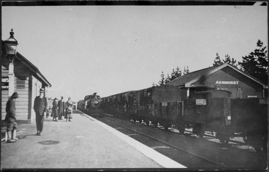 A train pulls into the Ashhurst Railway Station. Ashhurst Station operated as a simple flag station for its first year, then on 7 March 1892 the railway station was opened. It was an important stop before entering the Manawatū Gorge, on the Palmerston North to Woodville line. In 1980 the Ashhurst station building was sold by the Railway Department and the buildings demolished.