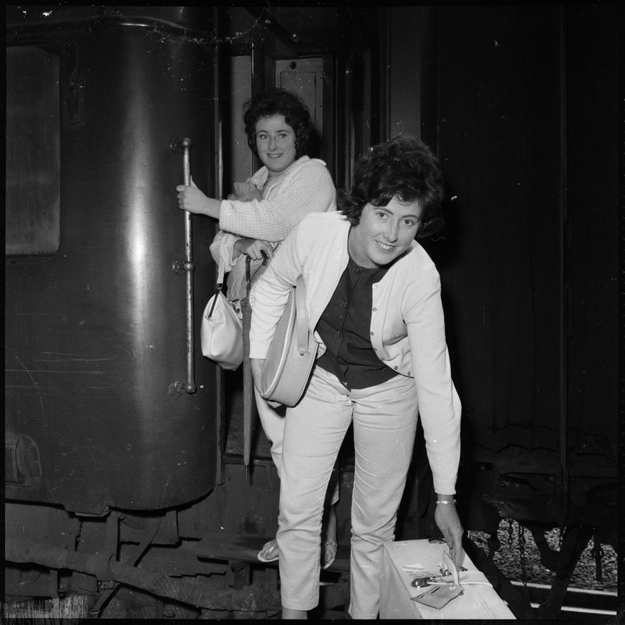 This image was taken for a story that ran in The Manawatu Evening Standard on 11th January, 1963. "Having had their holiday cut short through wet weather at the Chateau, these sisters, Miss P. Morgan (left) and Miss M. Morgan, of Palmerston North, had a frightening experience while travelling home on the Limited Express last night. Soil and rocks fell against their carriage in the slip that held up the express."