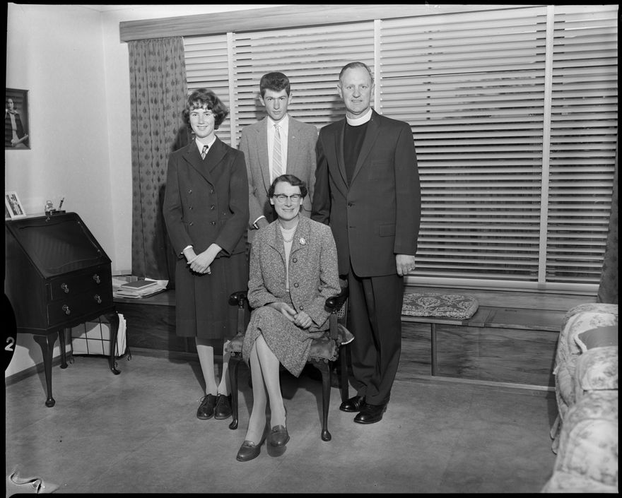 This image was taken for a story that ran in The Manawatu Evening Standard on 06 September 1960 "The Rev. L.M. King, who has been appointed the vicar of St. Andrew's Church, Epsom, photographed with Mrs. King and their son and daughter. Mr. King has been the vicar of St. Peter's Church, Terrace End for the past seven years."