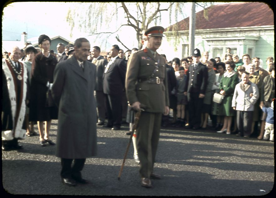 The Māori Battalion Hall, named 'Te Rau Aroha' (emblem of gratitude), was erected in Palmerston North as a national memorial to the men of the 28th (Māori) Battalion who lost their lives in the Second World War. It was designed by John Scott, architect of Hastings, and the 14 carved panels on the facade (8 feet x 1 foot 6 inches) were carved by Kelly Kereama of Feilding. Inside 639 names of those who did not return are inscribed on 14 brass plates. All the concrete, both inside and out, was left unplastered and with the marks of the boxing to symbolise the strength of the Māori people. The three-storey building was planned as a community centre to serve all races and was opened in June 1964 by the Governor General, Sir Bernard Fergusson. The man to his left is Hoani Meihana Te Rama Durie, also known as John Mason Durie (1889–1972). Mayor Gilbert Rennie was also in attendance, as well as a number of Māori veterans.