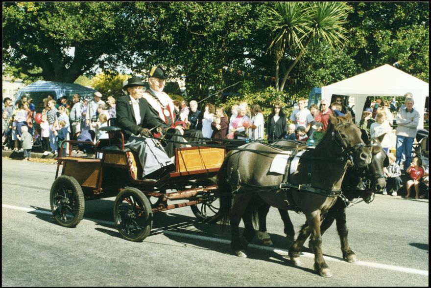 On the occasion of the Ashhurst (former) Post Office building's centenary. The building is now used at the town library. In this photograph the Mayor of Palmerston North, Paul Rieger, is being driven in a horse and trap.