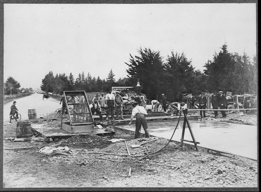 The laying of five chains of concrete road on Rangitikei Line, near the corner of Boundary Road (now Tremaine Ave). This view looks east towards Palmerston North with the Boundary Road intersection in the distance. George Craw from Linton is standing second from right. He undertook to lay this length of road for 30 pounds per chain for the Kairanga County Council. Harry Mouldey (a carpenter employed on Craw's farm) is standing on the right of the screen (with hat and hand on left knee). The other men are unidentified.