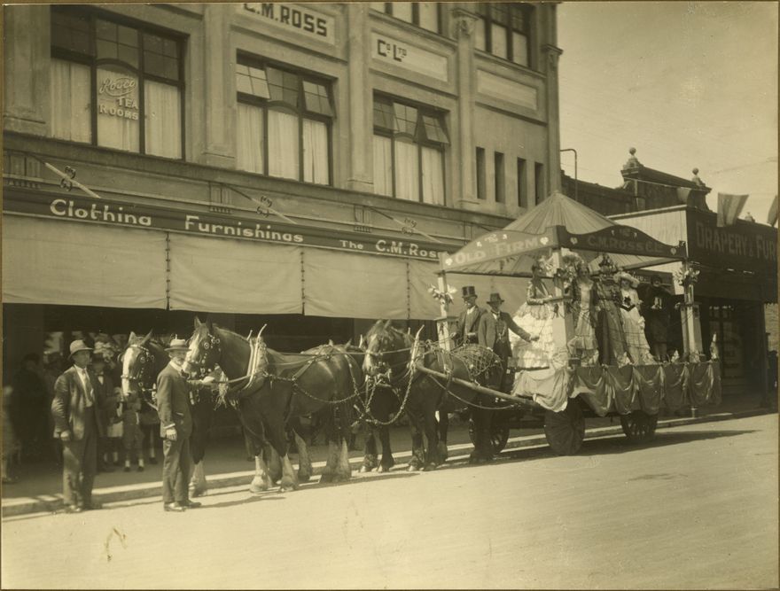 The C M Ross department store horse-drawn float stands outside the shop's entrance on George Street (near the corner of Coleman Mall). Rosscos, as it became known, became one of the foremost department stores in Palmerston North. It operated from 1883 - 1959, when the business was sold to Milne and Choyce.