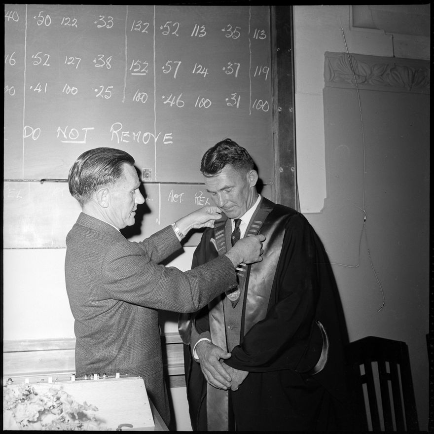 This image was taken for a story that ran in The Manawatu Evening Standard on 31 January, 1964. "Mr G. F. Sommerville, of Feilding, recieves the chain of office as the new president of the New Zealand Veterinarians' Association from the retiring president, Dr M. B. Buddie, at the annual meeting of the association at Massey University of Manawatu."