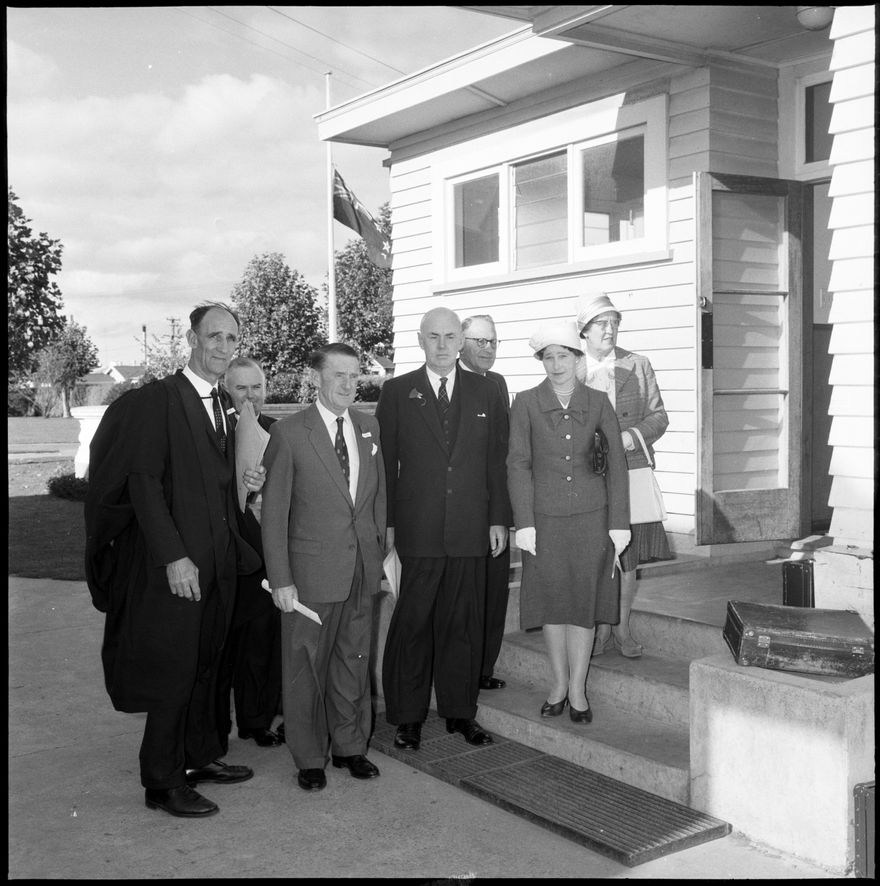 This image was taken for a story that ran in The Manawatu Evening Standard on 27 April 1961 "The official party at the Palmerston North Boys' High School ANZAC service is seen before entering the hall. They are (from the left): The rector (Mr. E.S. Craven), The Rev. J.E.B. Clegg, Mr. W.E. Norris (president of the Parents' Association), Mr. D.G. Sinclair, S.M., Mr. H.W. Kerr (a former teacher), Mrs. E.S. Craven, and Mrs. W.E. Norris."