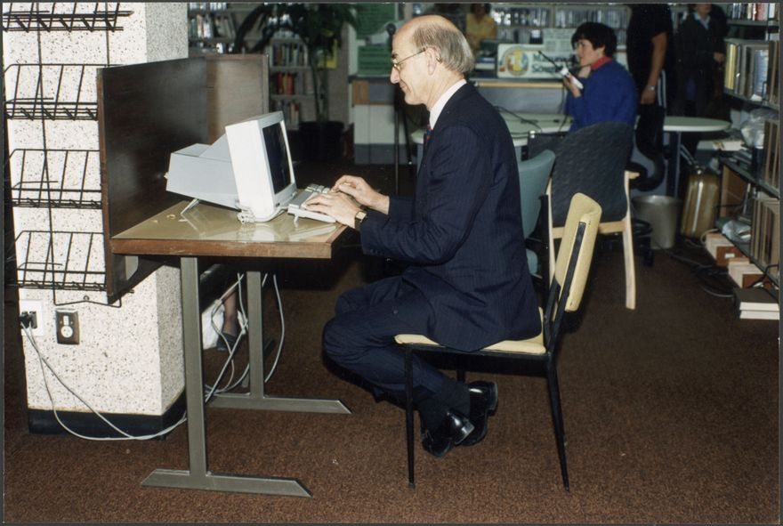 Mayor, Paul Rieger, at a computer terminal in the Palmerston North Public Library.The Public Library was on the corner of The Square and Main Street. Taken on the occasion of the millionth issue of a library item.