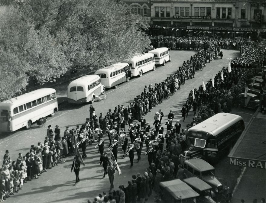 Peace with Germany was announced 8 May 1945 and official celebrations took place in Palmerston North the following day. Church services were held at 10am, followed by general celebrations. The procession marched round The Square to the Band Rotunda