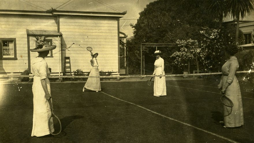 Women playing tennis at an unidentified location. Emily Hill (sister of Edith Mechen) is at the back, right.