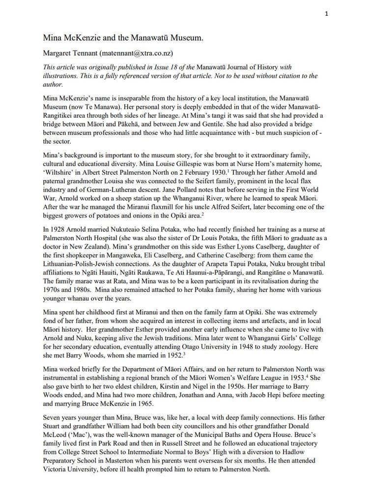 Mina McKenzie was the first director of the Manawatū Museum and the first Māori museum director in Aotearoa New Zealand. This article focuses on her outstanding contribution to the Manawatū Museum. It was originally published in issue 18 of the Manawatū Journal of History and included illustrations. This is a fully referenced version of that article.
