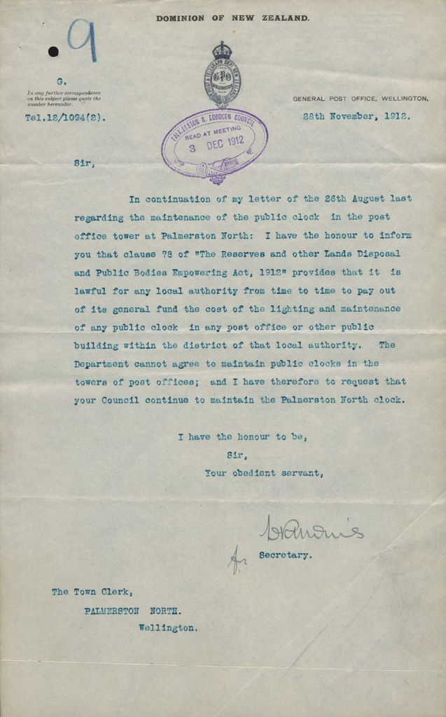 A new Chief Post Office for Palmerston North was opened in 1906, complete with clock tower. In the letter the General Post Office informs the PNCC that it is lawful for local authorities to pay for maintenance of public clocks. The tower and clock were removed after the 1942 Wairarapa earthquake and the clock and chimes reinstated in the new Clock Tower in The Square, opened 1957.