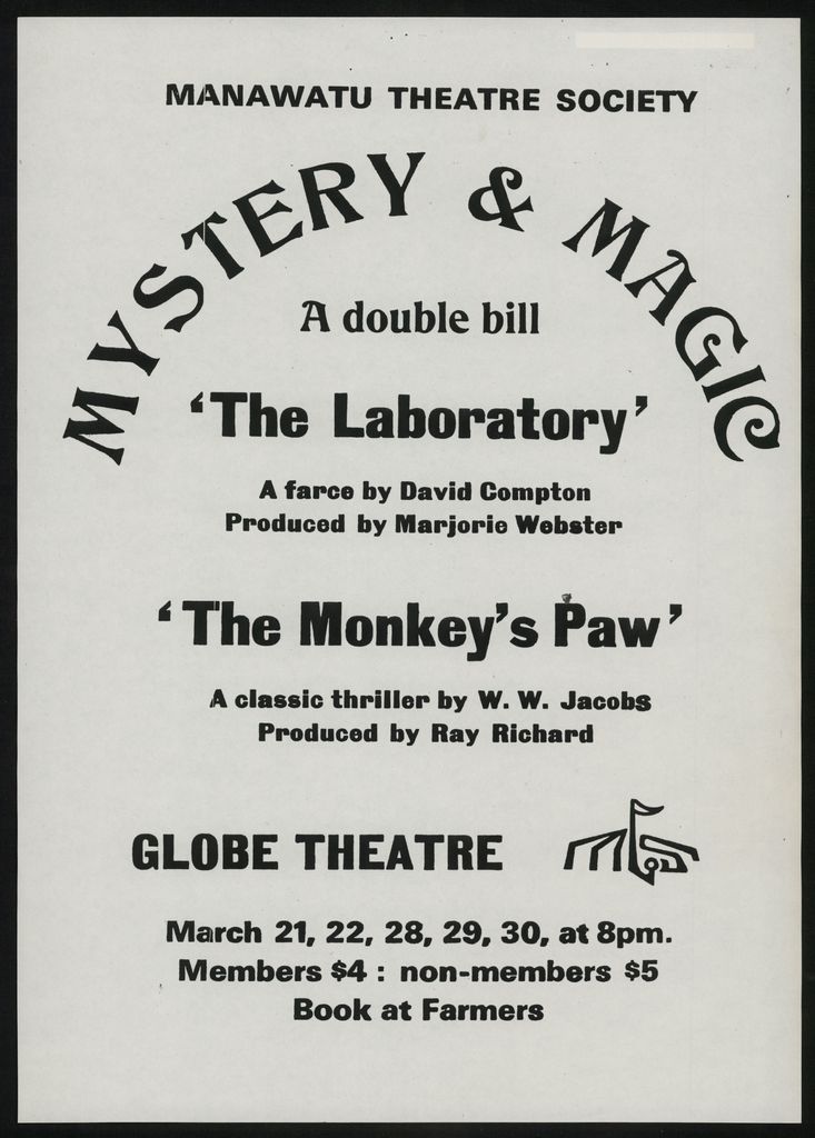 Manawatu Theatre Society. Mystery & Magic. A double bill. 'The Laboratory'. A farce by David Compton. Produced by marjorie Webster. 'The Monkey's Paw'. A classic thriller by W. W. Jacobs. Produced by Ray Richard. Globe Theatre. March 21, 22, 28, 29, 30 at 8 p.m. Members $4 : non members $5. Book at Farmers." Part of a collection of posters that were displayed in the Public Library in the 1970s - 1980s.