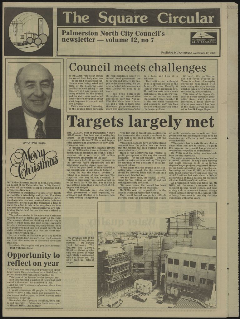 The Square Circular was Palmerston North City Council's monthly community publication, informing Palmerstonians of PNCC initiatives, activites, and events. This month's issue includes: Paul Rieger; Michael Willis; budgets; Science centre and Manawatu museum; art gallery; Regent theatre; library; George Street; Terrace End cemetery; parks and reserves; water quality; stopbanks; building standards; parking; waste management; recycling; liquor licensing.