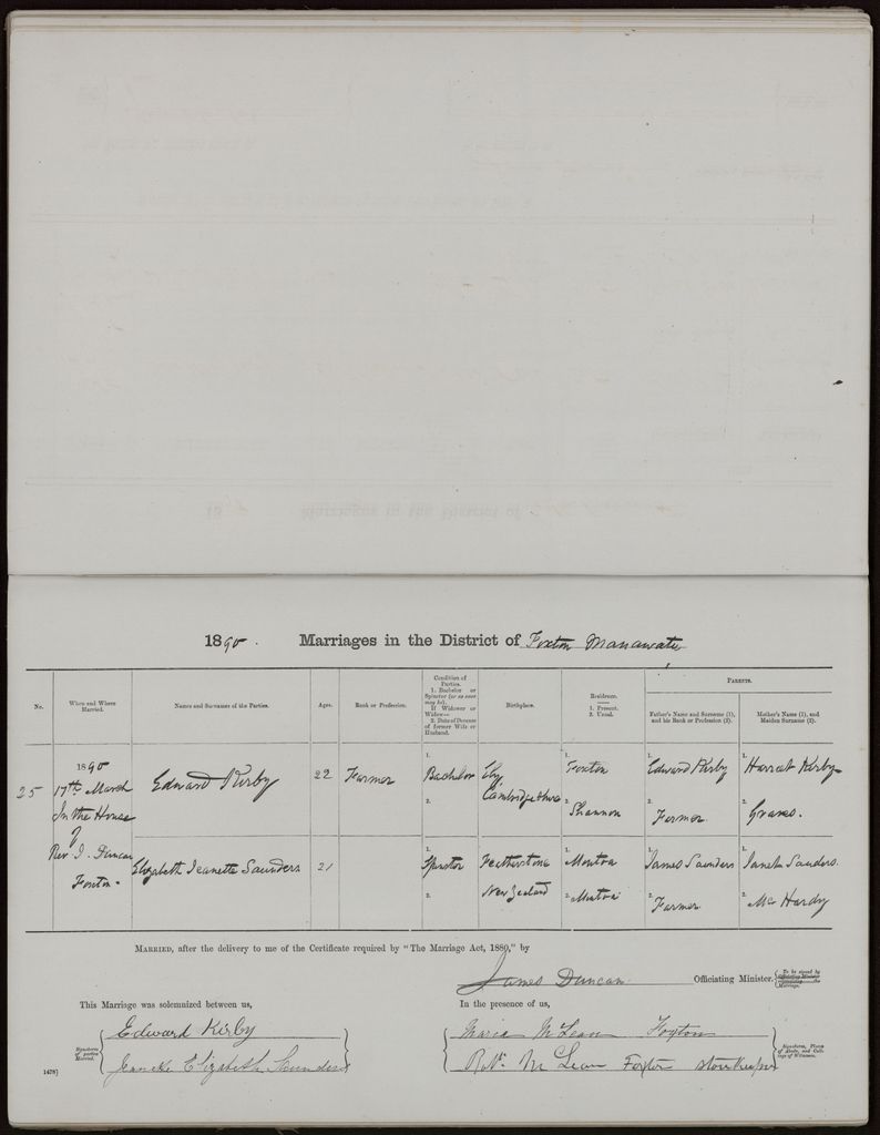 This marriage register was for the Foxton Presbyterian Church from December 1880 to June 1894. The reverend was Reverend James Duncan. It includes registry of marriages outside Foxton and Certificates of Dissolution of Marriages where applicable.