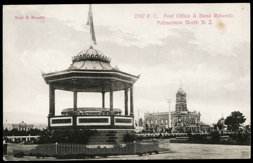Postcard of the band rotunda that was in The Square of Palmerston North. Beyond can be seen the Chief Post Office on the corner of Main Street.