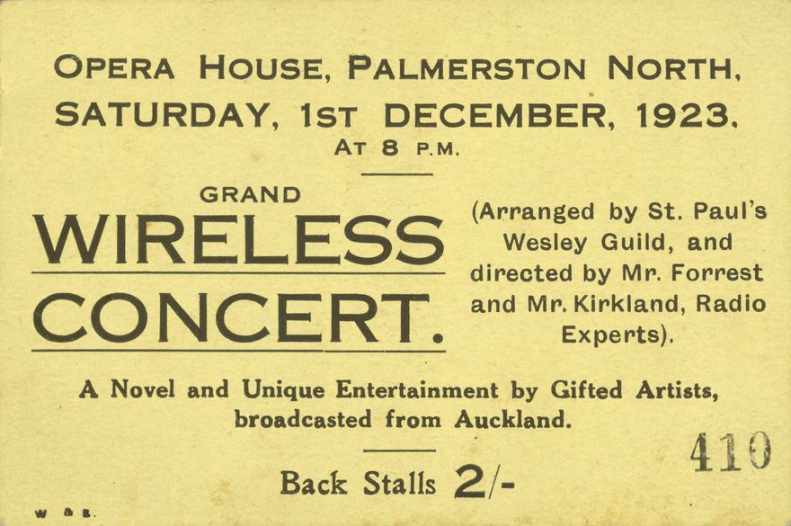 A Grand Wireless Concert, broadcast from Auckland, was held in the Opera House, Palmerston North, 1 December 1923. It was arranged by St Paul's Wesley Guild. Ticket no.410, for the Back Stalls at a cost of 2/-.