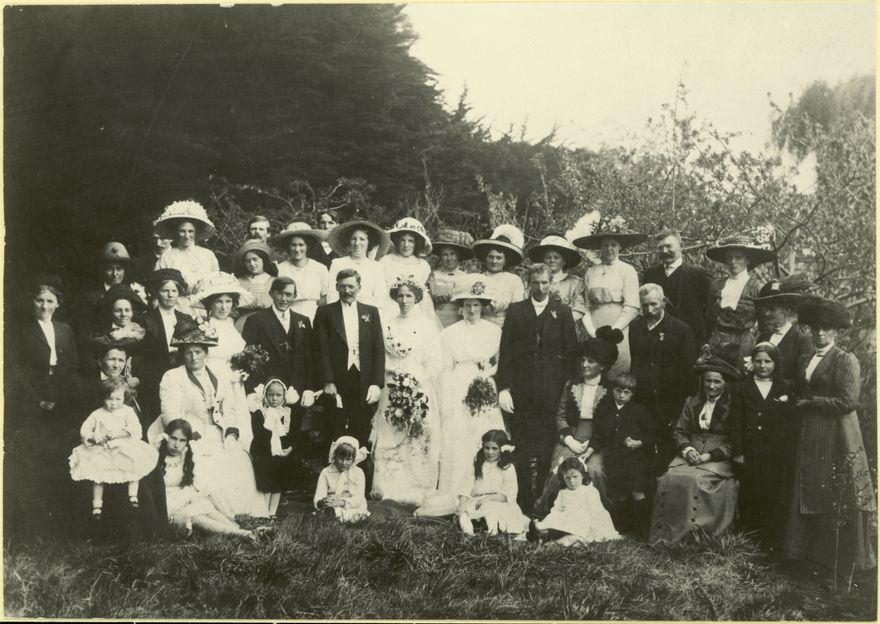 This photograph was taken at Hughes Farm, No 2 Line, Foxton. People from left. Children: Unknown, Doris Hughes, Unknown, Lorna Robinson, Eileen Bowe, Unknown, Unknown. (Children whose names are unknown may belong to Mr and Mrs Ingram. The wife may have been Miss Ingram.) Sitting left: Mrs Ingram (?), Mrs Edwards (?). First row, standing: Mrs Ingram (?), Mrs Burr, Myrtle Ingram, Pearl Hughes, Sandy Buick (bridegroom), Ethel Hughes (bride), Ivy Hughes, George Hughes, Martha Hughes (sitting), George Hughes (senior), Mrs Bowe (sitting), Eileen Robinson (girl), Mrs Robinson, Mrs Wibley. 2nd row, standing: Nora Neylon, Mabel Hughes, Julie Bowe, Annie Bowe, Mary Hughes, Ruth Nye, Mrs Seddon, Mrs Blanche (nee Buick), Mrs Sandy Buick, Bill Buick, Mrs Harry Satherley. Back row: Hughie Hughes, Bob Cochran, Harry Hughes (all partially obscured by ladies hats). The photographer was reputed to have had trouble with arranging the group because of the ladies' large hats. He caused much amusement by accidentally treading on his own hat while trying to get things just right.