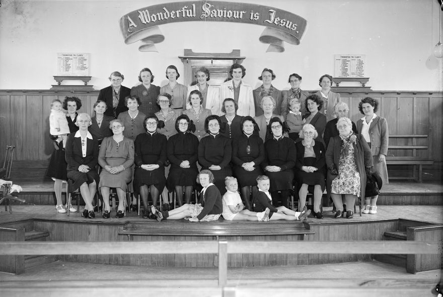 A group of unidentified women and children, some in Salvation Army uniform, in their citadel in Broadway. The Salvation Army Band established themselves in Palmerston North in 1884.
