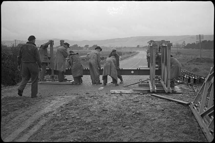 Captions read:“Watched by local residents a workman removes the thin, deceptive layer of tarseal on the approach to the bridge at Whakarongo, near Stoney Creek Road, after heavy rain had swollen the stream and caused a washout.”