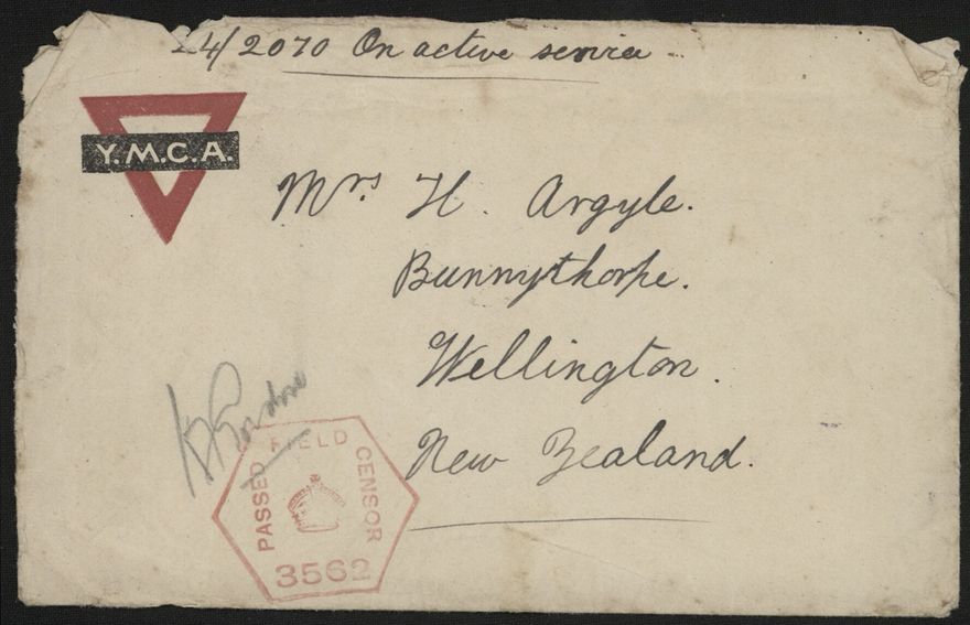 Envelope addressed to Mrs Henry (Alice) Argyle of Bunnythorpe, from one of her sons, Pat or Len, who served overseas in World War One. Both men died at Gallipoli in 1915.