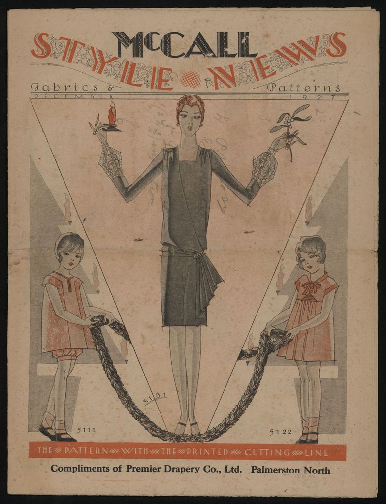 The cover of this booklet reads, "McCall Style News - Fabrics - Patterns - December 1927 - The Pattern with the Printed Cutting Line - Compliments of the Premier Drapery Co., Ltd. Palmerston North"
