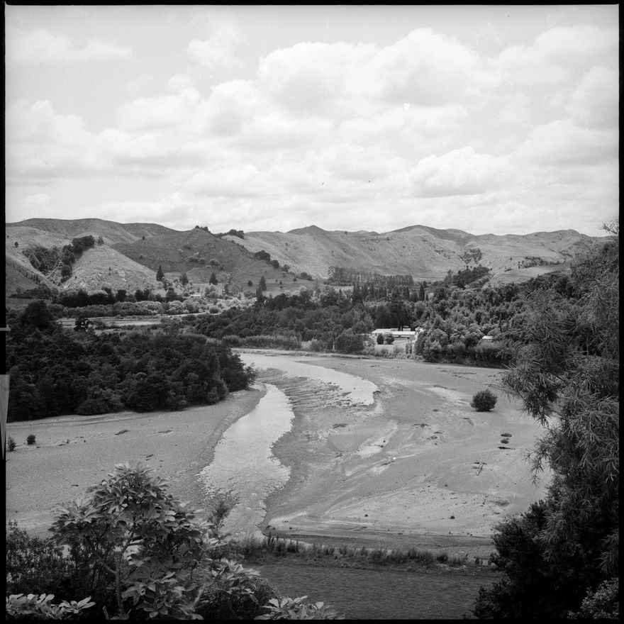 This image was taken for a story that ran in the Manawatu Evening Standard on 8 January, 1964. "What must be one of the most beautiful scenic attractions in the Manawatu is the Pohangina Valley. Fortunate enough to have a reasonably good day, a "Manawatu Standard" photographer captured this scene, overlooking the river towards the Y.M.C.A. boys' camp."