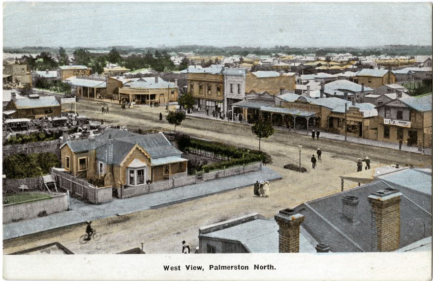 A west view of the corner of George and Cuba Streets, Palmerston North, probably taken from the roof of the belltower of the Fire Station. Photograph used by G H Bennett and Co. on a postcard.
