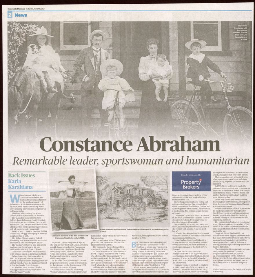 Local historians weekly "Back Issues" article in the Manawatū Standard. The life story of Constance Abraham (1864-1942). Mother of seven, community leader in Palmerston North and accomplished sportswoman.