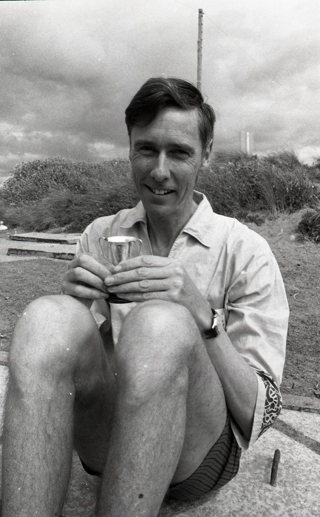 This photograph ran in the Manawatu Evening Standard on January 3 1976 with the caption, "[the] winner of the 'knobbly knees' competition at Himatangi Beach on New Year's Day was the Rev. Peter Davies, minister at the Bulls Presbyterian Church."