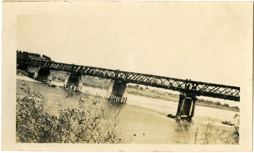 This photograph came from a small photograph album that belonged to Mrs R Andrews of Rangitikei House. This photograph has no caption but appears to depict the first Fitzherbert Bridge. Built in 1877, this wooden bridge served the needs of those crossing the Manawatu until 1935 when a new concrete bridge was constructed. This second bridge was replaced with the bridge we have today [2015] in 1987.