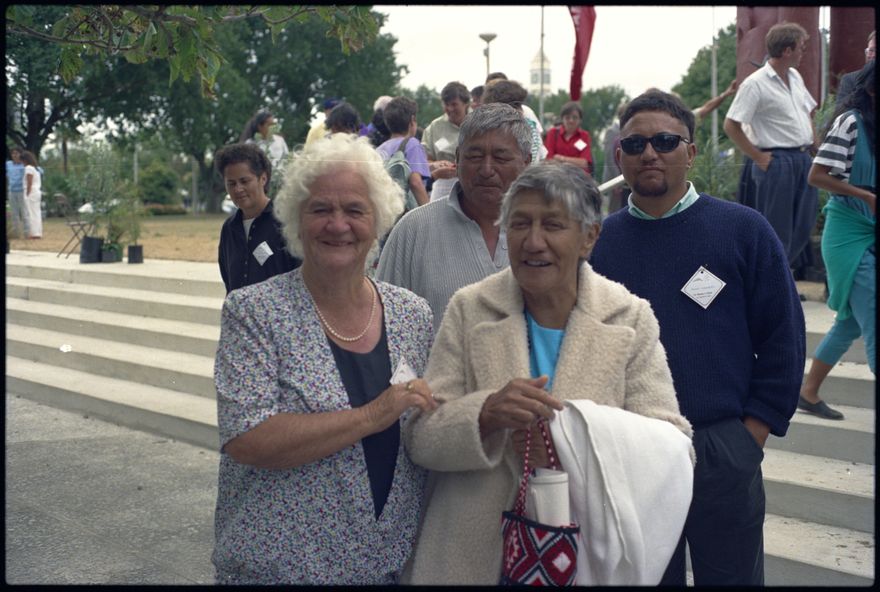 Images from the re-dedication of Te Marae o Hine on Saturday, 3 March, 1990. The following notes were written by City Archivist, Ian Matheson, around the time of the re-dedication. Background: Te Marae o Hine is that part of The Square on which stands the statue of Te Peeti Te Awe Awe and the City Council building. The name, The Courtyard of the Daughter of Peace was offered to Te Peeti Te Awe Awe one hundred and eleven years ago by Matene Te Whiwhi, Paramount Chief of Ngati Raukawa in memory of his ancestress, Rongorito, a famous peacemaker who lived in Waikato thirteen generations ago. Te Peeti Te Awe Awe received the name and offered it to the first Mayor of Palmerston North, George Snelson in the hope that there would be peace between all citizens of Palmerston North. 1990: The City of Palmerston North has commissioned a set of 9 great carvings to be placed in that part of The Square called Te Marae o Hine to form a gathering place for all people. The people of Rangitāne, tangata whenua of this area have imbued these taonga with their mana. They stand as a memorial to Rongorito and a tribute to the vision of Te Peeti Te Awe Awe, Matene Te Whiwhi and George Snelson.