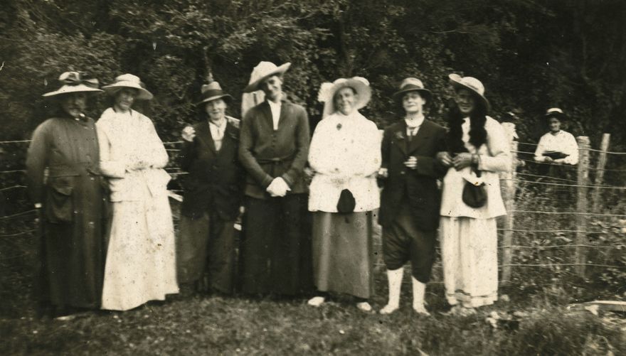 Men dressed as women and women dressed as men. This photograph is thought to have been taken near the Ballance Bridge reserve. From left: Sam MaCaulay; Unknown; Daisy Murray; Campbell Aitchison; Frank McLauglan; Unknown; Joe Macaulay; Margaretta Macaulay in the background.