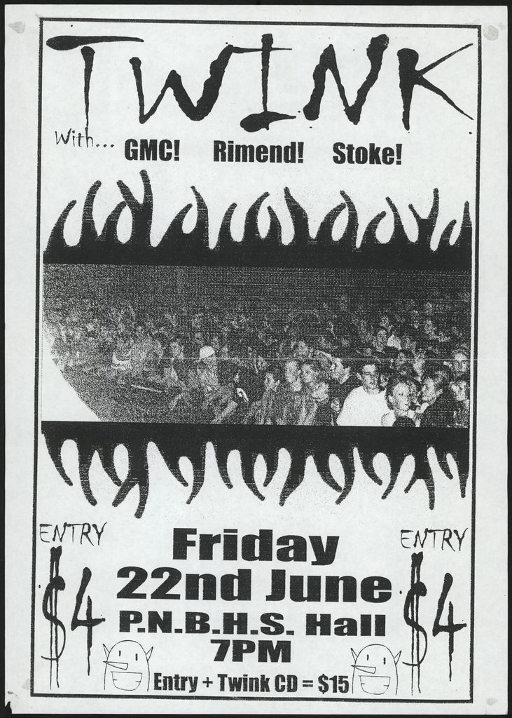 - Twink. With GMC! Rimend! Stoke! Friday 22nd June P.N.B.H.S. Hall 7pm. Entry $4. Entry Twink CD = $15.