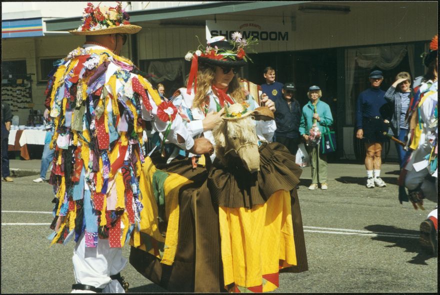On the occasion of the Ashhurst (former) Post Office building's centenary. The building is now used at the town library. Two people in costume stand waiting for the parade.