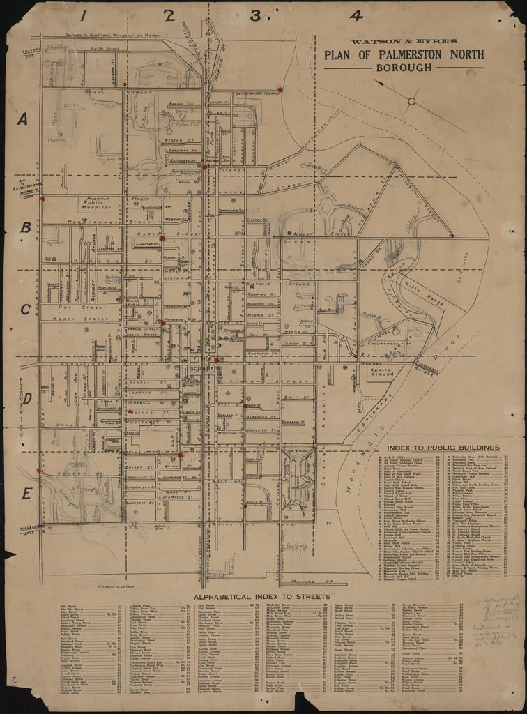 Map of Palmerston North produced by the printing firm, Watson and Eyre. Has an index to public buildings (and places) and streets.