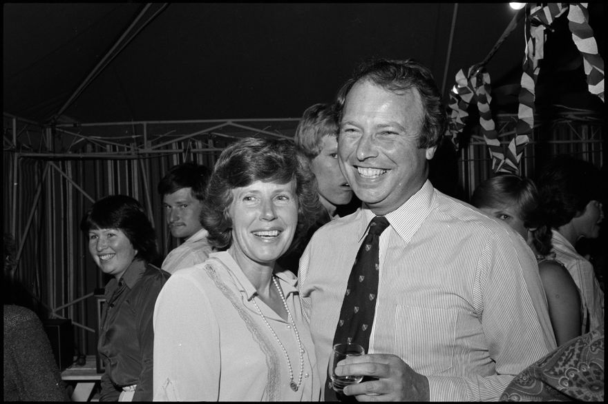 This image was taken by the Evening Standard on Saturday 28th of November 1981 and was published on Monday the 30th. It depicts the National Party's candidate for Manawatū Michael Cox and his wife Jenny with supporters during election night.