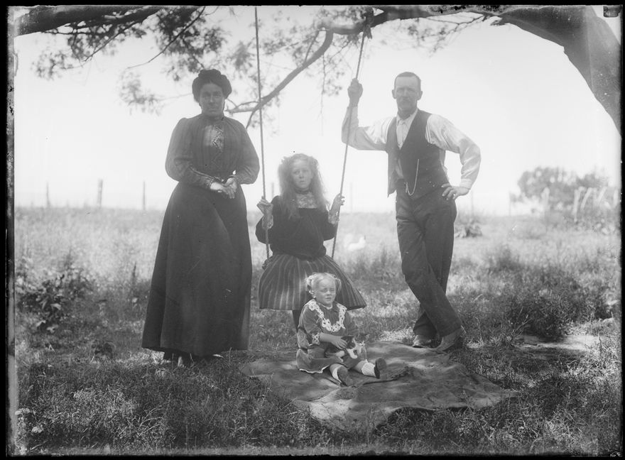 This photograph was created by William James Young in the early 20th century. A large variety of subjects are depicted in the collection, but family, rural life and travel are the most prominent themes. The exact location of the photographs in the Young Collection is unknown, but W J Young lived on a farm in Mt Stewart, Rangitikei, and some of the photographs include his house. The Young family were apparently avid travellers and photographs later in the collection feature scenes from Rotorua, Auckland, Whanganui, as well as other unidentified locations. The portraits are all unidentified, but are presumably of members of the Young family. The photographers parents were George Henry (b 1833) and Jane McDowell (b 1842, d 1916). They came to New Zealand in 1877. The same year, they bought the home farm on Mt Stewart and called it Kilrudden after Kilrudden House, the home of the McDowell family in Ireland. The couple had four children: Ann (b 1873), Margaret (b 1876), John (b 1878) and William James (b 1880). William James married Mary Elizabeth Thompson and they had four children: Doris (b 1914, d 1989), George (b 1916, d 1991), Royden McDowell (b 1925, d 1992) and Noel William (b 1927, d 2013).
