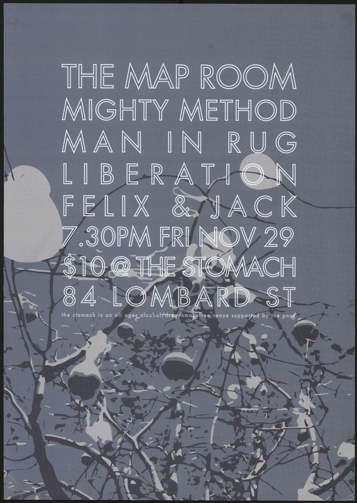 The Map Room. Mighty Method. Man in Rug. Liberation. Felix & Jack. 7.30 pm Fri Nov 29 $10 @ The Stomach 84 Lombard St. The Stomach is an all ages alcohol/drug/smokefree venue supported by the PNCC. Part of a collection of posters that were displayed at The Stomach, Lombard Street, venue for Creative Sounds Society Incorporated.