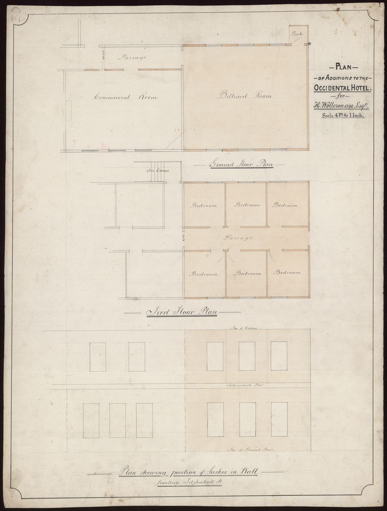 This plan for additions to the Occidental Hotel was designed by L. G. West for H. Wollerman. The first Occidental Hotel was built on the corner of Fitzherbert Street (now Avenue) and The Square in c.1887. It burnt down in September of 1891 and was replaced by a similar building which was also destroyed by a fire in 1927. The Danish-born architect Ludolph Georg West (1846-1919) established an architectural practice in Palmerston North in about 1880. In 1912 he formed a partnership with is son, Ernest Vilhem West, who continued the business after his father's death.