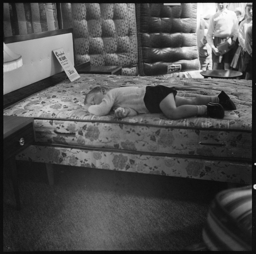 This image was taken for a story that ran in The Manawatu Evening Standard on 07 November 1960 "The stock, the machinery, the sideshows and the heat proved too much for this little lad at the Manawatu and West Coast A. and P. Association's Show on Saturday. The lure of a mattress retailers stall was too great an attraction. While mother was making an inspection of some latest household appliance he sat down only for the sandman to pay an early visit. His mother sat with him for nearly an hour, while the attendant of the stall revelled in the free advertising the child was unconsciously providing."