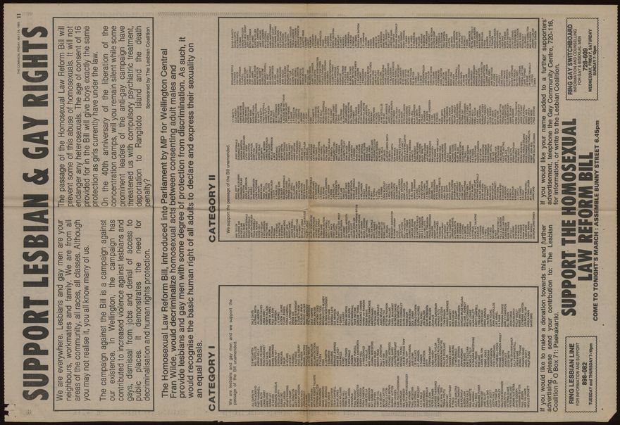 It also includes copies of letters between organisers Peter Pawson and Kevin Baston to both Fran Wilde (Member of Parliament who sponsored the Homosexual Law Reform Bill in 1985) and Rangitikei Member of Parliament Denis Marshall.