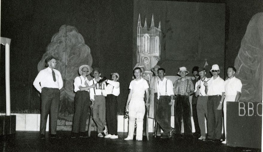 The Palmerston North Boys High School musical production was performed 10-12 December 1962. Pictured are the cast singing 'The Chorus of Village Cricketers' from the Village of Cattlecud scene. From left: Ian Matheson; Peter Hosking; Philip Monk; Peter Jackson; Paul Chadwick; David Jannock (obscured); Richard Letteron (partially obscured); David Yockney; Unkown; Unknown; Bill Foster; Unknown; Michael Dunlop.