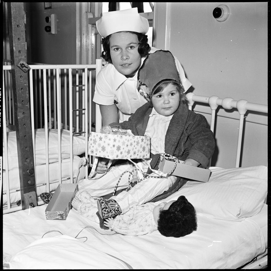 This image was taken for a story that ran in The Manawatu Evening Standard on 27th December 1965 "Three-year old Valerie Larkin, who spent Christmas in the children's ward of the Palmerston North Hospital, shows her gifts to yet another member of the staff, Nurse Newman after Santa Claus has visited the ward on Christmas Day."