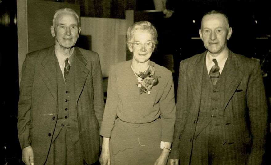 Mr Lunn, Mr Hunt and Sylvia Haycock, at celebration to mark Miss Haycock’s 50 years of service for C M Ross Co. Ltd